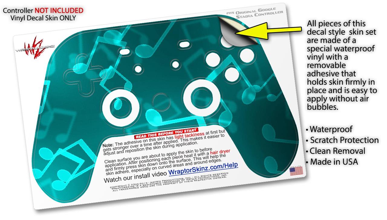 This product is in no way affiliated with or endorsed by Google. WraptorSkinz® skin wraps work with the Original Google Stadia version 1 Controller. Printed using superb photo quality designs and vibrant colors printed with special fade resistant inks that last even in direct sun for years. WraptorSkinz are a composite of two layers of commercial grade materials. The bottom layer is a soft, flexible vinyl with a special removable adhesive that is easily positioned, applied without air bubbles. Next, we print the bottom layer with UV protected, fade resistant inks that deliver superb photo quality designs in vibrant colors. Finally, we bond a professional grade laminate over the entire skin adding a glossy protective finish.