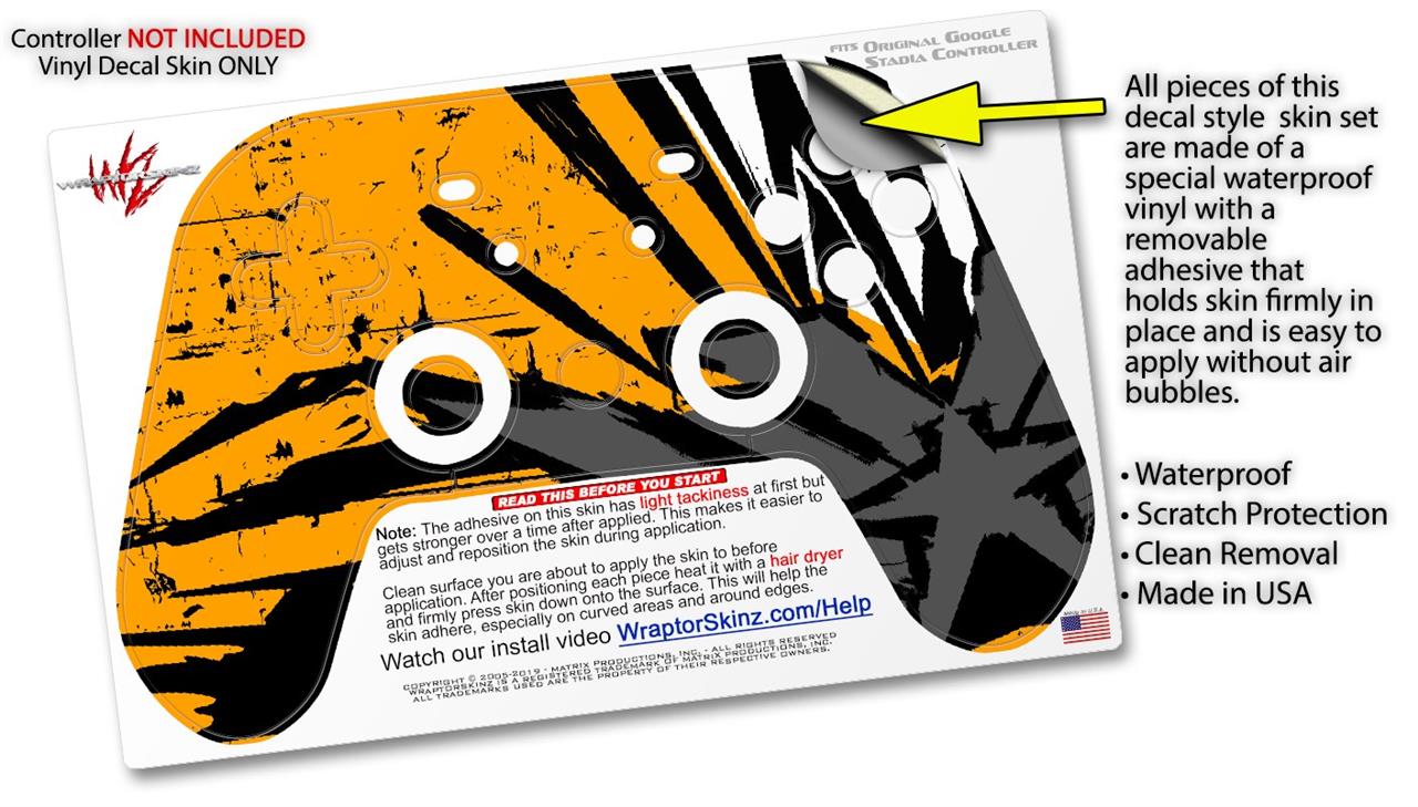 This product is in no way affiliated with or endorsed by Google. WraptorSkinz® skin wraps work with the Original Google Stadia version 1 Controller. Printed using superb photo quality designs and vibrant colors printed with special fade resistant inks that last even in direct sun for years. WraptorSkinz are a composite of two layers of commercial grade materials. The bottom layer is a soft, flexible vinyl with a special removable adhesive that is easily positioned, applied without air bubbles. Next, we print the bottom layer with UV protected, fade resistant inks that deliver superb photo quality designs in vibrant colors. Finally, we bond a professional grade laminate over the entire skin adding a glossy protective finish.