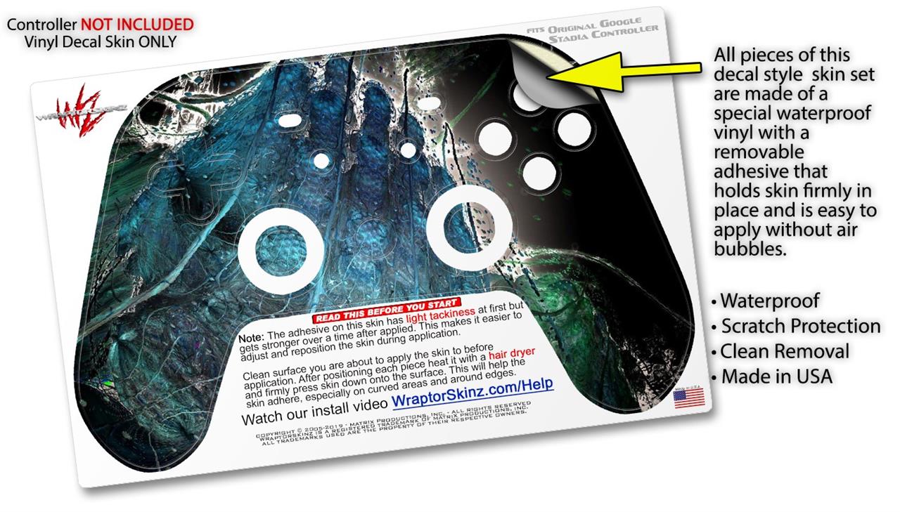 This product is in no way affiliated with or endorsed by Google. WraptorSkinz® skin wraps work with the Original Google Stadia version 1 Controller. Printed using superb photo quality designs and vibrant colors printed with special fade resistant inks that last even in direct sun for years. WraptorSkinz are a composite of two layers of commercial grade materials. The bottom layer is a soft, flexible vinyl with a special removable adhesive that is easily positioned, applied without air bubbles. Next, we print the bottom layer with UV protected, fade resistant inks that deliver superb photo quality designs in vibrant colors. Finally, we bond a professional grade laminate over the entire skin adding a glossy protective finish.