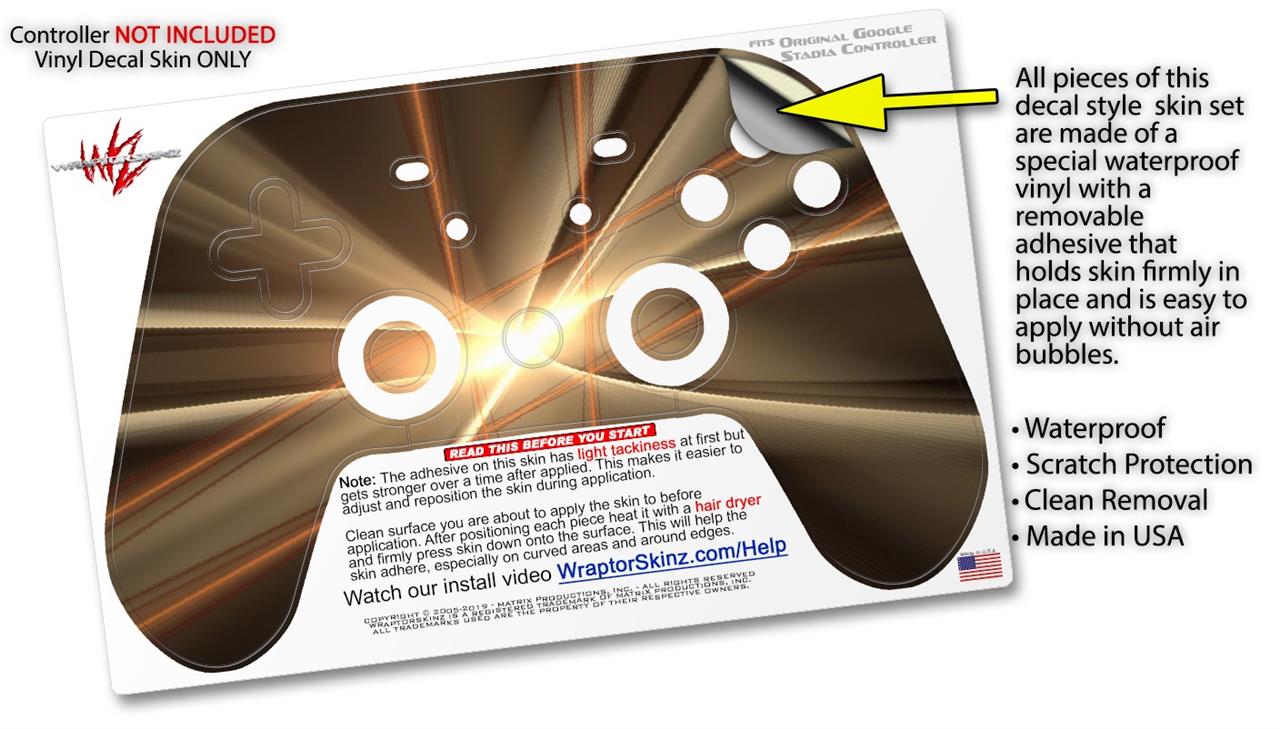 This product is in no way affiliated with or endorsed by Google. WraptorSkinz® skin wraps work with the Original Google Stadia version 1 Controller. Printed using superb photo quality designs and vibrant colors printed with special fade resistant inks that last even in direct sun for years. WraptorSkinz are a composite of two layers of commercial grade materials. The bottom layer is a soft, flexible vinyl with a special removable adhesive that is easily positioned, applied without air bubbles. Next, we print the bottom layer with UV protected, fade resistant inks that deliver superb photo quality designs in vibrant colors. Finally, we bond a professional grade laminate over the entire skin adding a glossy protective finish.
