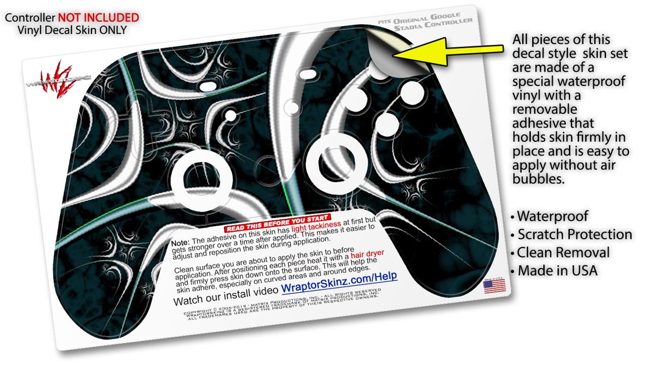 This product is in no way affiliated with or endorsed by Google. WraptorSkinz® skin wraps work with the Original Google Stadia version 1 Controller. Printed using superb photo quality designs and vibrant colors printed with special fade resistant inks that last even in direct sun for years. WraptorSkinz are a composite of two layers of commercial grade materials. The bottom layer is a soft, flexible vinyl with a special removable adhesive that is easily positioned, applied without air bubbles. Next, we print the bottom layer with UV protected, fade resistant inks that deliver superb photo quality designs in vibrant colors. Finally, we bond a professional grade laminate over the entire skin adding a glossy protective finish.