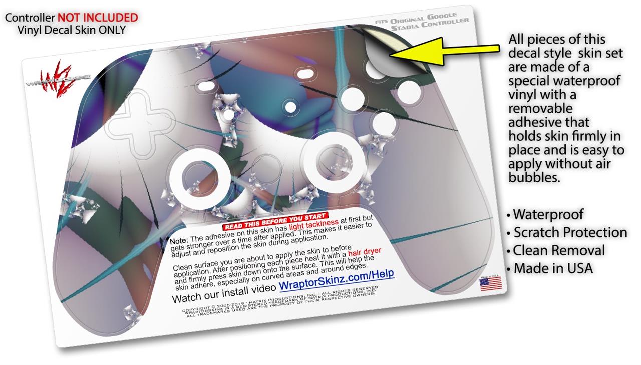 This product is in no way affiliated with or endorsed by Google. WraptorSkinz® skin wraps work with the Original Google Stadia version 1 Controller. Printed using superb photo quality designs and vibrant colors printed with special fade resistant inks that last even in direct sun for years. WraptorSkinz are a composite of two layers of commercial grade materials. The bottom layer is a soft, flexible vinyl with a special removable adhesive that is easily positioned, applied without air bubbles. Next, we print the bottom layer with UV protected, fade resistant inks that deliver superb photo quality designs in vibrant colors. Finally, we bond a professional grade laminate over the entire skin adding a glossy protective finish.