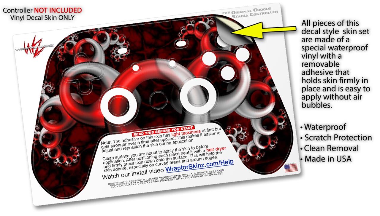This product is in no way affiliated with or endorsed by Google. WraptorSkinz® skin wraps work with the Original Google Stadia version 1 Controller. Printed using superb photo quality designs and vibrant colors printed with special fade resistant inks that last even in direct sun for years. WraptorSkinz are a composite of two layers of commercial grade materials. The bottom layer is a soft, flexible vinyl with a special removable adhesive that is easily positioned, applied without air bubbles. Next, we print the bottom layer with UV protected, fade resistant inks that deliver superb photo quality designs in vibrant colors. Finally, we bond a professional grade laminate over the entire skin adding a glossy protective finish.
