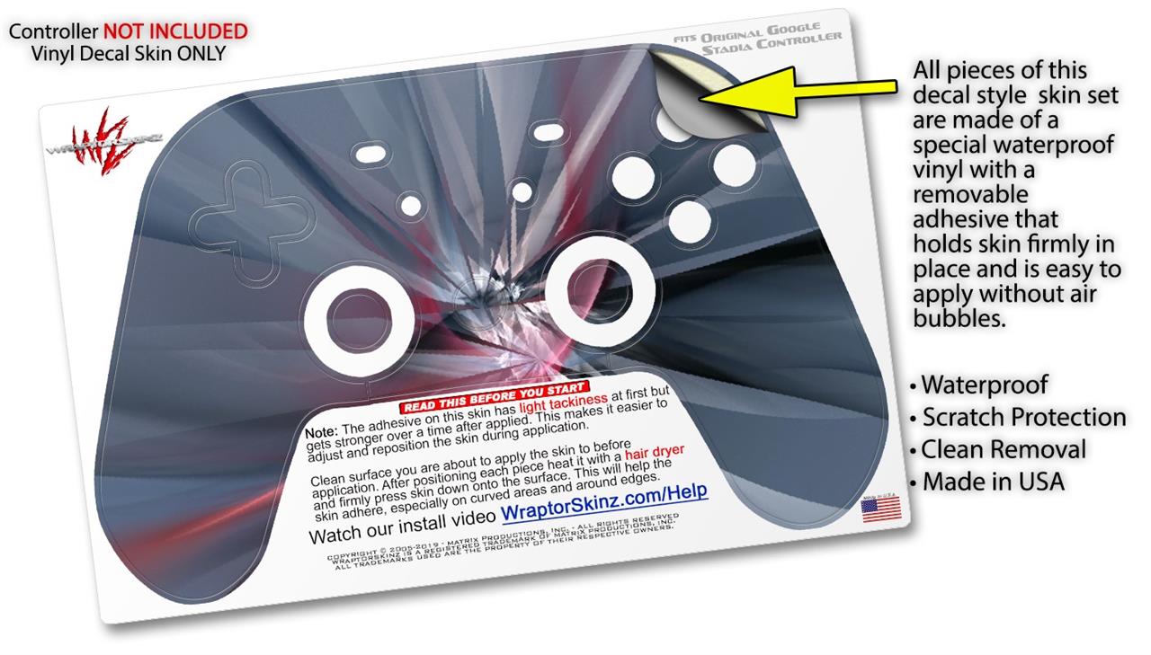 This product is in no way affiliated with or endorsed by Google. WraptorSkinz® skin wraps work with the Original Google Stadia version 1 Controller. Printed using superb photo quality designs and vibrant colors printed with special fade resistant inks that last even in direct sun for years. WraptorSkinz are a composite of two layers of commercial grade materials. The bottom layer is a soft, flexible vinyl with a special removable adhesive that is easily positioned, applied without air bubbles. Next, we print the bottom layer with UV protected, fade resistant inks that deliver superb photo quality designs in vibrant colors. Finally, we bond a professional grade laminate over the entire skin adding a glossy protective finish.