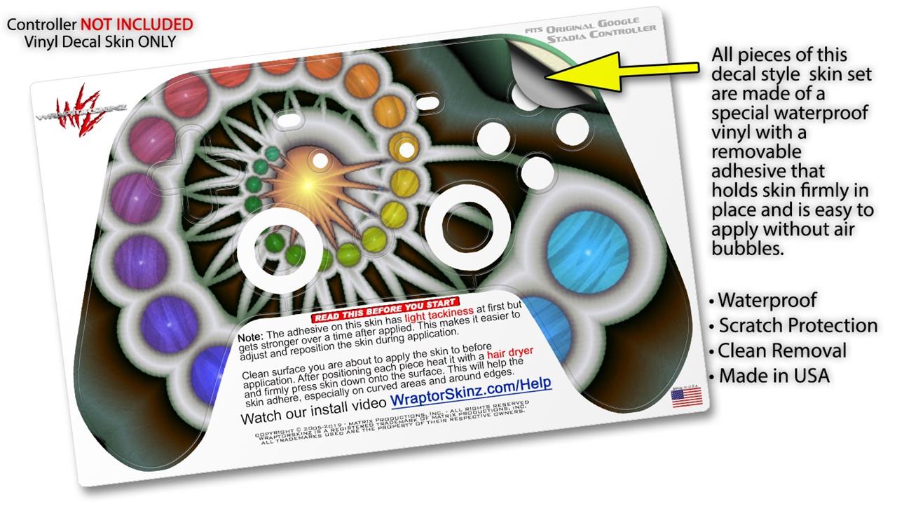 This product is in no way affiliated with or endorsed by Google. WraptorSkinz® skin wraps work with the Original Google Stadia version 1 Controller. Printed using superb photo quality designs and vibrant colors printed with special fade resistant inks that last even in direct sun for years. WraptorSkinz are a composite of two layers of commercial grade materials. The bottom layer is a soft, flexible vinyl with a special removable adhesive that is easily positioned, applied without air bubbles. Next, we print the bottom layer with UV protected, fade resistant inks that deliver superb photo quality designs in vibrant colors. Finally, we bond a professional grade laminate over the entire skin adding a glossy protective finish.