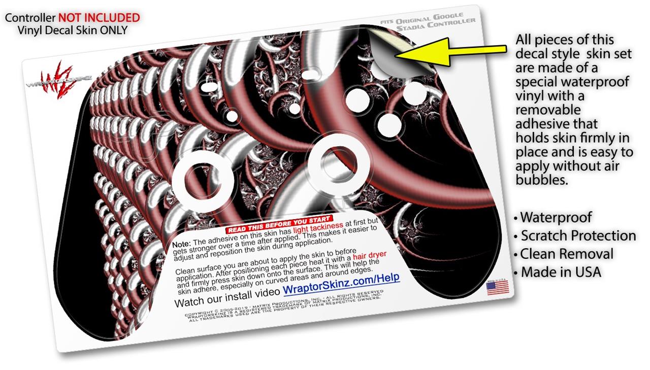 This product is in no way affiliated with or endorsed by Google. WraptorSkinz® skin wraps work with the Original Google Stadia version 1 Controller. Printed using superb photo quality designs and vibrant colors printed with special fade resistant inks that last even in direct sun for years. WraptorSkinz are a composite of two layers of commercial grade materials. The bottom layer is a soft, flexible vinyl with a special removable adhesive that is easily positioned, applied without air bubbles. Next, we print the bottom layer with UV protected, fade resistant inks that deliver superb photo quality designs in vibrant colors. Finally, we bond a professional grade laminate over the entire skin adding a glossy protective finish.
