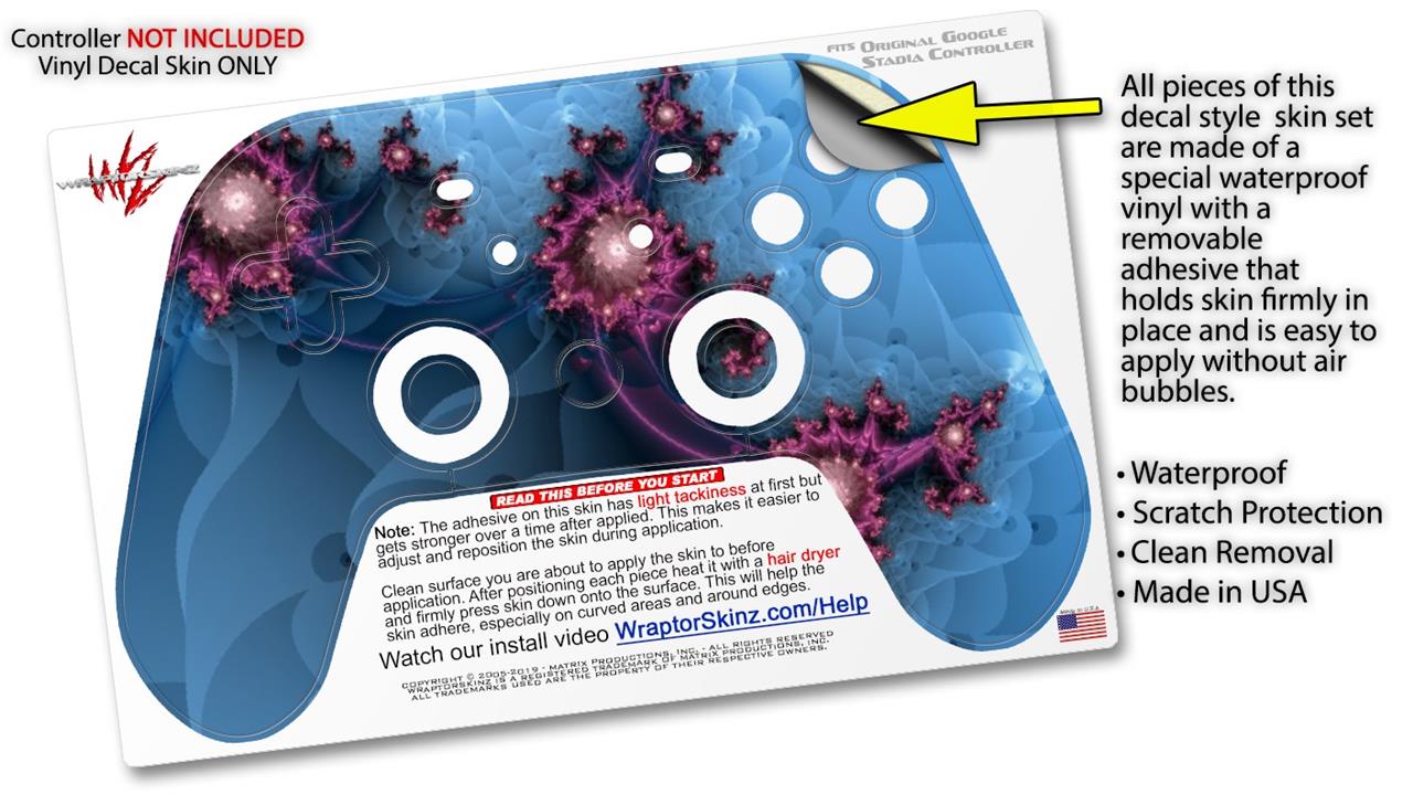 This product is in no way affiliated with or endorsed by Google. WraptorSkinz® skin wraps work with the Original Google Stadia version 1 Controller. Printed using superb photo quality designs and vibrant colors printed with special fade resistant inks that last even in direct sun for years. WraptorSkinz are a composite of two layers of commercial grade materials. The bottom layer is a soft, flexible vinyl with a special removable adhesive that is easily positioned, applied without air bubbles. Next, we print the bottom layer with UV protected, fade resistant inks that deliver superb photo quality designs in vibrant colors. Finally, we bond a professional grade laminate over the entire skin adding a glossy protective finish.