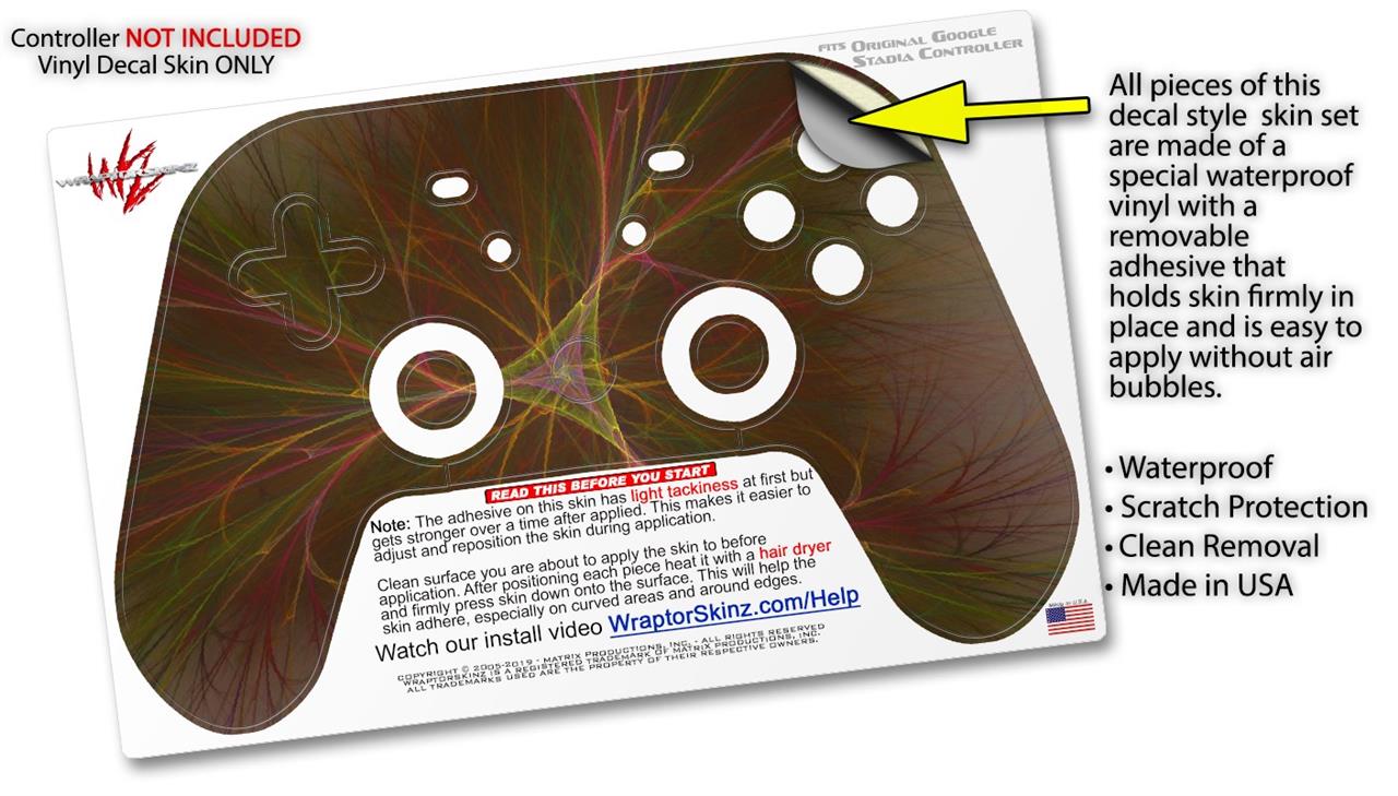 This product is in no way affiliated with or endorsed by Google. WraptorSkinz® skin wraps work with the Original Google Stadia version 1 Controller. Printed using superb photo quality designs and vibrant colors printed with special fade resistant inks that last even in direct sun for years. WraptorSkinz are a composite of two layers of commercial grade materials. The bottom layer is a soft, flexible vinyl with a special removable adhesive that is easily positioned, applied without air bubbles. Next, we print the bottom layer with UV protected, fade resistant inks that deliver superb photo quality designs in vibrant colors. Finally, we bond a professional grade laminate over the entire skin adding a glossy protective finish.