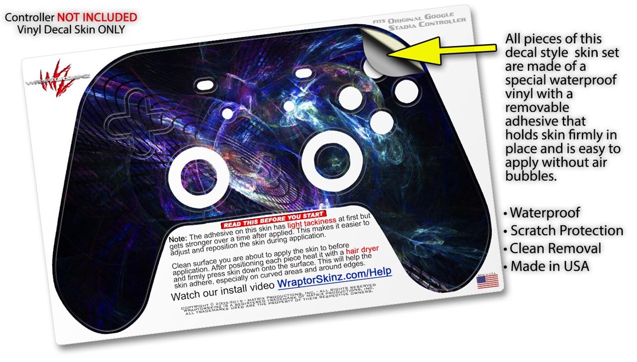 This product is in no way affiliated with or endorsed by Google. WraptorSkinz® skin wraps work with the Original Google Stadia version 1 Controller. Printed using superb photo quality designs and vibrant colors printed with special fade resistant inks that last even in direct sun for years. WraptorSkinz are a composite of two layers of commercial grade materials. The bottom layer is a soft, flexible vinyl with a special removable adhesive that is easily positioned, applied without air bubbles. Next, we print the bottom layer with UV protected, fade resistant inks that deliver superb photo quality designs in vibrant colors. Finally, we bond a professional grade laminate over the entire skin adding a glossy protective finish.