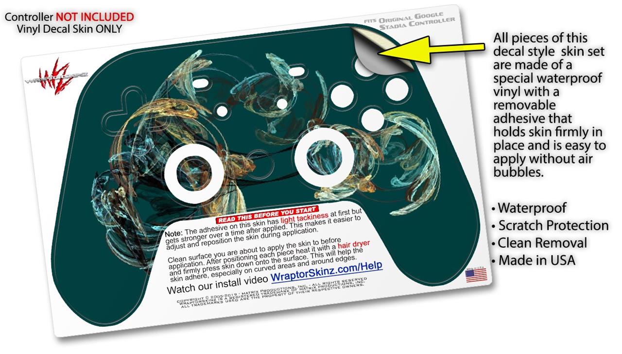 This product is in no way affiliated with or endorsed by Google. WraptorSkinz® skin wraps work with the Original Google Stadia version 1 Controller. Printed using superb photo quality designs and vibrant colors printed with special fade resistant inks that last even in direct sun for years. WraptorSkinz are a composite of two layers of commercial grade materials. The bottom layer is a soft, flexible vinyl with a special removable adhesive that is easily positioned, applied without air bubbles. Next, we print the bottom layer with UV protected, fade resistant inks that deliver superb photo quality designs in vibrant colors. Finally, we bond a professional grade laminate over the entire skin adding a glossy protective finish.