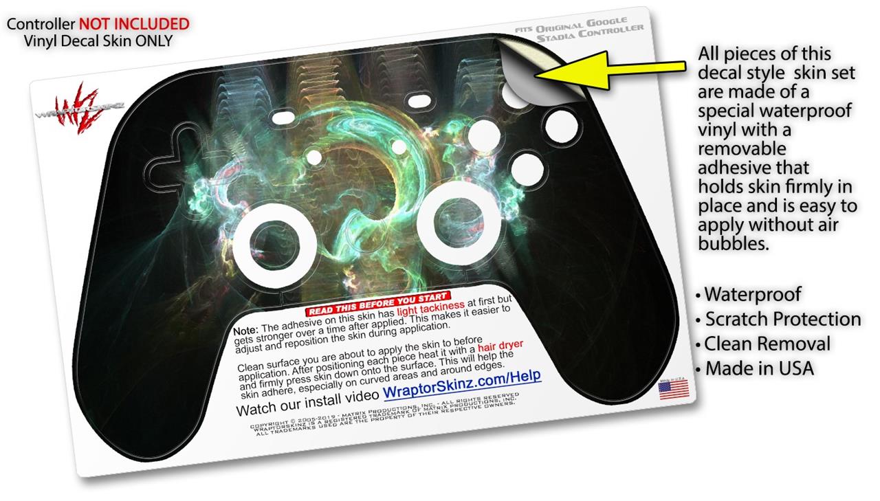 This product is in no way affiliated with or endorsed by Google. WraptorSkinz® skin wraps work with the Original Google Stadia version 1 Controller. Printed using superb photo quality designs and vibrant colors printed with special fade resistant inks that last even in direct sun for years. WraptorSkinz are a composite of two layers of commercial grade materials. The bottom layer is a soft, flexible vinyl with a special removable adhesive that is easily positioned, applied without air bubbles. Next, we print the bottom layer with UV protected, fade resistant inks that deliver superb photo quality designs in vibrant colors. Finally, we bond a professional grade laminate over the entire skin adding a glossy protective finish.