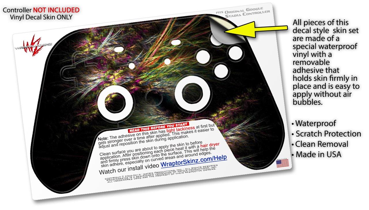 This product is in no way affiliated with or endorsed by Google. WraptorSkinz® skin wraps work with the Original Google Stadia version 1 Controller. Printed using superb photo quality designs and vibrant colors printed with special fade resistant inks that last even in direct sun for years. WraptorSkinz are a composite of two layers of commercial grade materials. The bottom layer is a soft, flexible vinyl with a special removable adhesive that is easily positioned, applied without air bubbles. Next, we print the bottom layer with UV protected, fade resistant inks that deliver superb photo quality designs in vibrant colors. Finally, we bond a professional grade laminate over the entire skin adding a glossy protective finish.