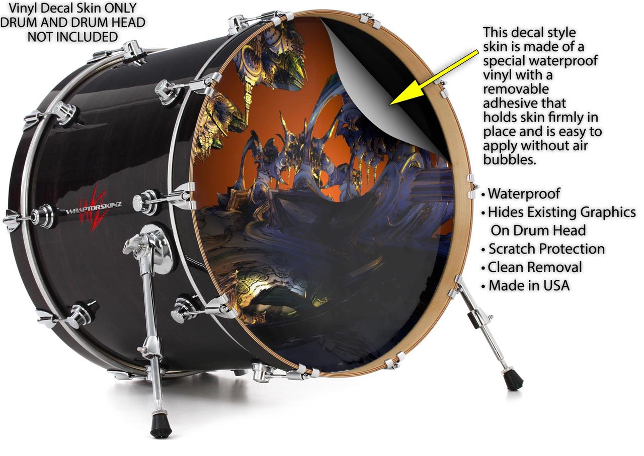 This design also available in other sizes. WraptorSkinz® skin wraps compatible with most kick drum heads. Printed using superb photo quality designs and vibrant colors printed with special fade resistant inks that last even in direct sun for years. WraptorSkinz are a composite three layer commercial grade materials vinyl. The bottom layer is a air release, grey block out removable adhesive that hides existing graphics on the drum head and is easily applied without air bubbles. The middle layer is a flexible vinyl printed with UV protected, fade resistant inks that deliver superb photo quality designs in vibrant colors. Finally, we bond a professional grade laminate over the entire skin adding a glossy protective finish.