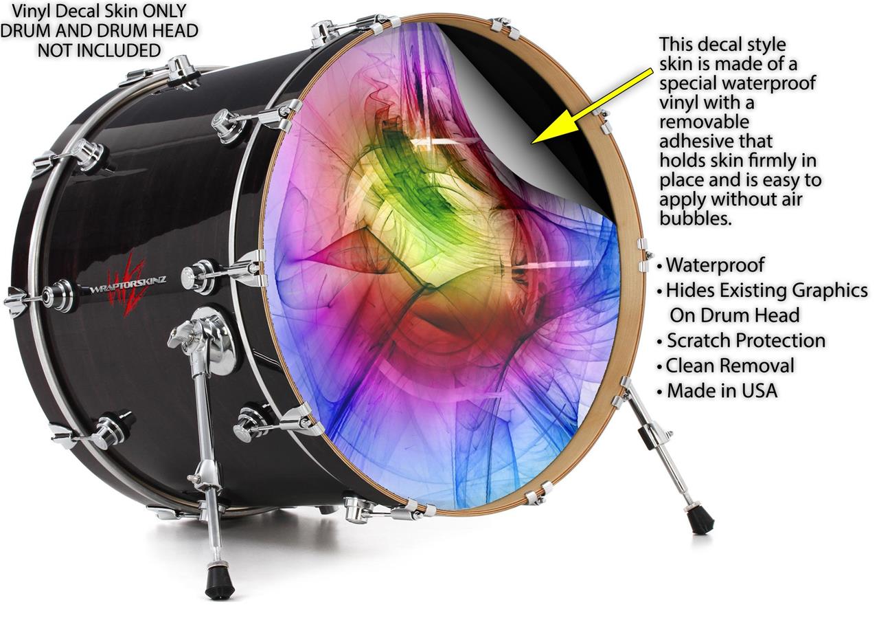 This design also available in other sizes. WraptorSkinz® skin wraps compatible with most kick drum heads. Printed using superb photo quality designs and vibrant colors printed with special fade resistant inks that last even in direct sun for years. WraptorSkinz are a composite three layer commercial grade materials vinyl. The bottom layer is a air release, grey block out removable adhesive that hides existing graphics on the drum head and is easily applied without air bubbles. The middle layer is a flexible vinyl printed with UV protected, fade resistant inks that deliver superb photo quality designs in vibrant colors. Finally, we bond a professional grade laminate over the entire skin adding a glossy protective finish.