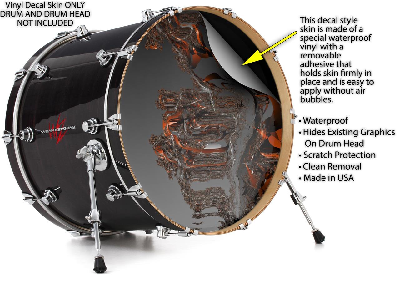 This design also available in other sizes. WraptorSkinz® skin wraps compatible with most kick drum heads. Printed using superb photo quality designs and vibrant colors printed with special fade resistant inks that last even in direct sun for years. WraptorSkinz are a composite three layer commercial grade materials vinyl. The bottom layer is a air release, grey block out removable adhesive that hides existing graphics on the drum head and is easily applied without air bubbles. The middle layer is a flexible vinyl printed with UV protected, fade resistant inks that deliver superb photo quality designs in vibrant colors. Finally, we bond a professional grade laminate over the entire skin adding a glossy protective finish.