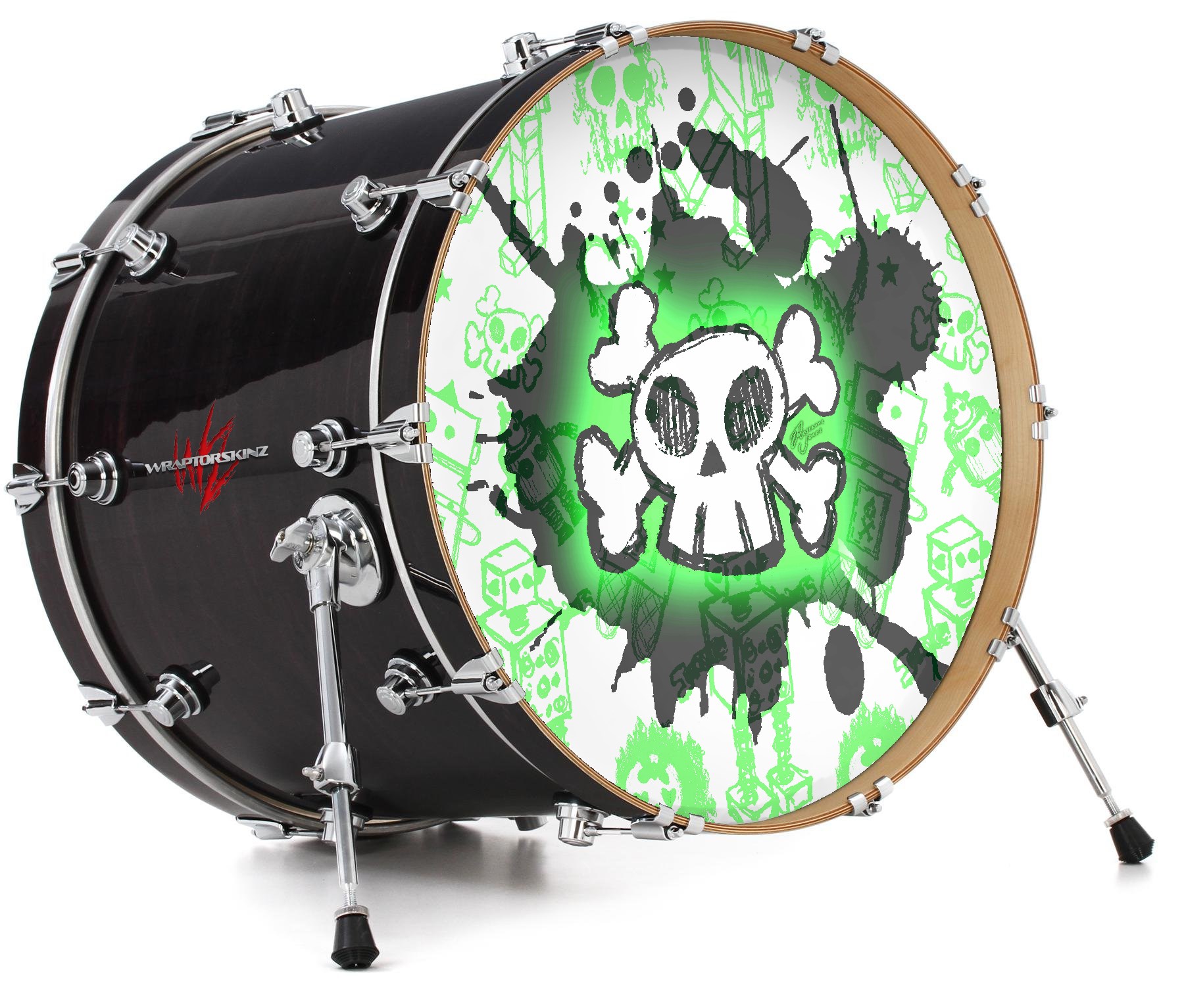 This design also available in other sizes. WraptorSkinz® skin wraps compatible with most kick drum heads. Printed using superb photo quality designs and vibrant colors printed with special fade resistant inks that last even in direct sun for years. WraptorSkinz are a composite three layer commercial grade materials vinyl. The bottom layer is a air release, grey block out removable adhesive that hides existing graphics on the drum head and is easily applied without air bubbles. The middle layer is a flexible vinyl printed with UV protected, fade resistant inks that deliver superb photo quality designs in vibrant colors. Finally, we bond a professional grade laminate over the entire skin adding a glossy protective finish.