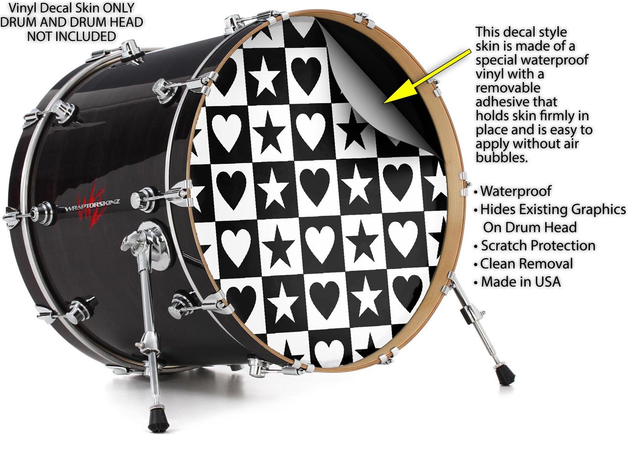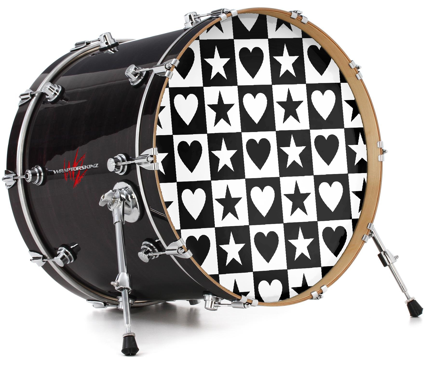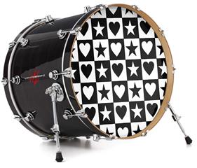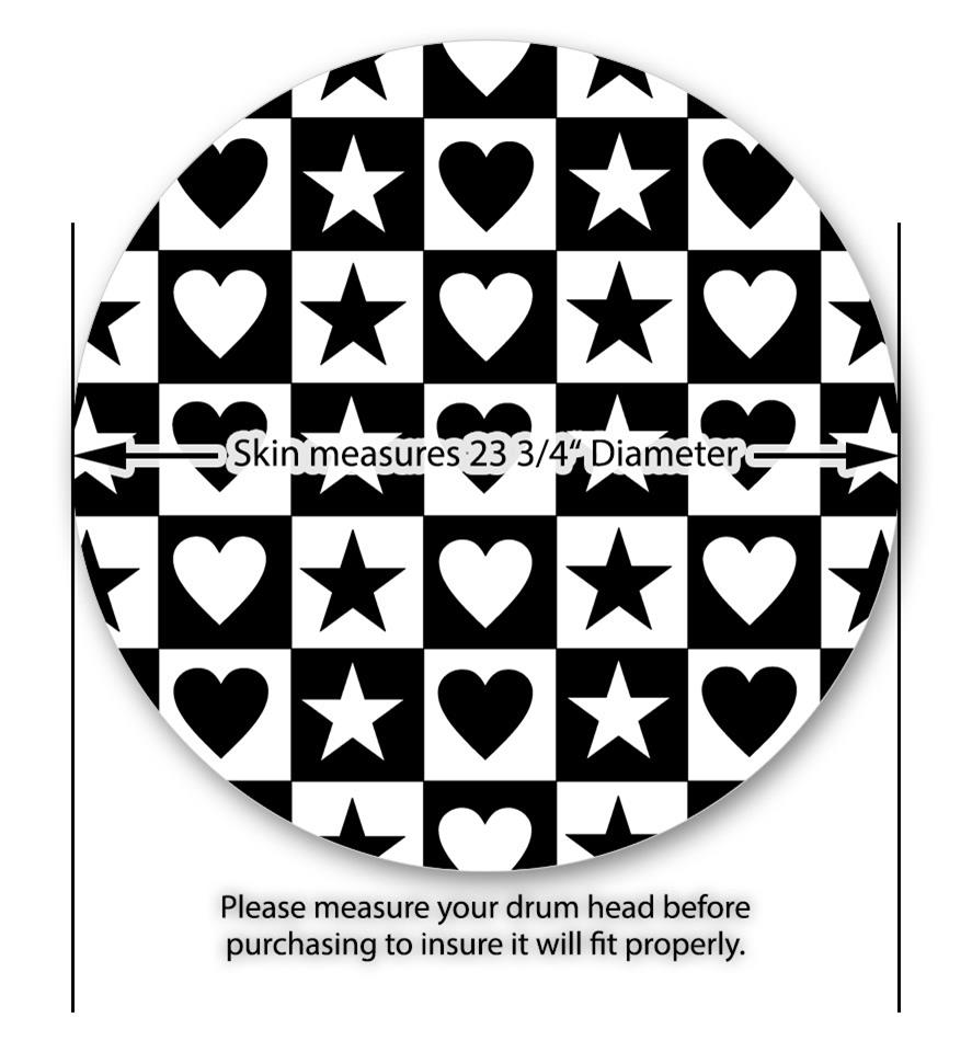 Decal Skin works with most 24" Bass Kick Drum Heads Hearts And Stars Black and White - DRUM HEAD NOT INCLUDED