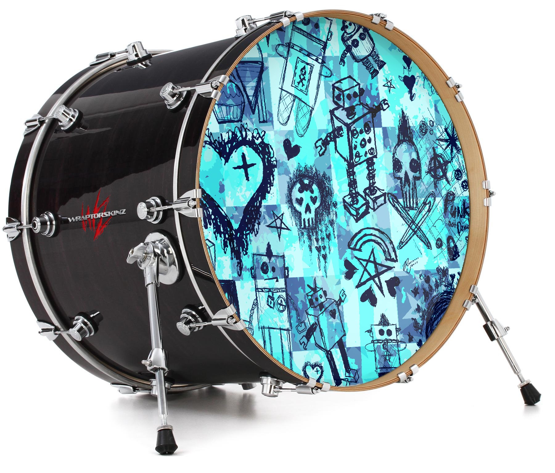 This design also available in other sizes. WraptorSkinz® skin wraps compatible with most kick drum heads. Printed using superb photo quality designs and vibrant colors printed with special fade resistant inks that last even in direct sun for years. WraptorSkinz are a composite three layer commercial grade materials vinyl. The bottom layer is a air release, grey block out removable adhesive that hides existing graphics on the drum head and is easily applied without air bubbles. The middle layer is a flexible vinyl printed with UV protected, fade resistant inks that deliver superb photo quality designs in vibrant colors. Finally, we bond a professional grade laminate over the entire skin adding a glossy protective finish.