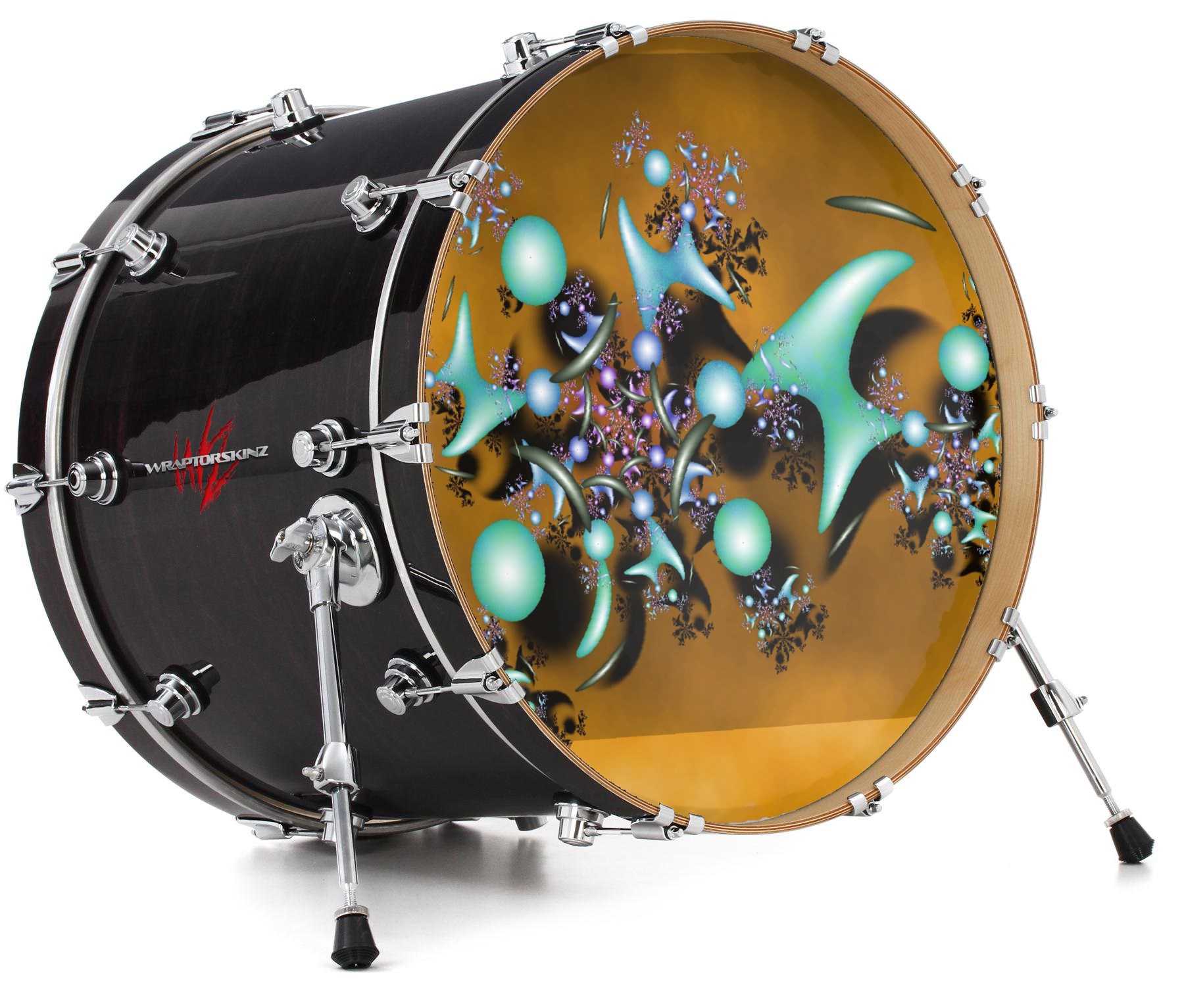 This design also available in other sizes. WraptorSkinz® skin wraps compatible with most kick drum heads. Printed using superb photo quality designs and vibrant colors printed with special fade resistant inks that last even in direct sun for years. WraptorSkinz are a composite three layer commercial grade materials vinyl. The bottom layer is a air release, grey block out removable adhesive that hides existing graphics on the drum head and is easily applied without air bubbles. The middle layer is a flexible vinyl printed with UV protected, fade resistant inks that deliver superb photo quality designs in vibrant colors. Finally, we bond a professional grade laminate over the entire skin adding a glossy protective finish.