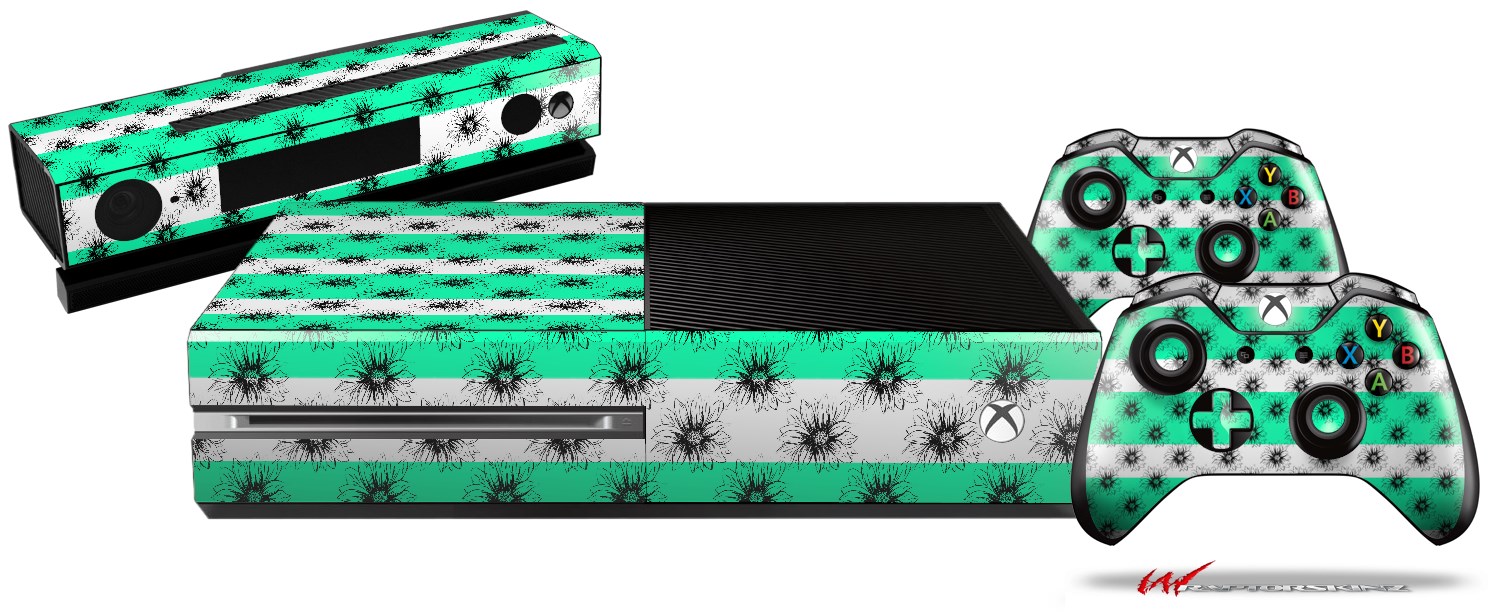 Kearas Daisies Stripe Sea Foam - Holiday Bundle Decal Style Skin fits XBOX One Console Original, Kinect and 2 Controllers (XBOX SYSTEM NOT INCLUDED)