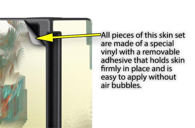 WraptoSkinz™ skins are superb photo quality designs and vibrant colors printed with special Eco-Friendly, fade resistant inks. Our skins are self-adhering flexible vinyl skins that helps prevent scratches. Made of composite, multi-layered commercial grade materials. The bottom layer is made with a special removable adhesive that is easily positioned and applied without air bubbles. We print your design on the bottom layer then bond a professional grade laminate over the entire skin adding a glossy protective finish.